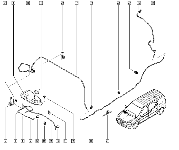 Nie wiem czy ktos na to wpadl..ale mi sie cos takiego przytrafilo w MII..a zakladam ze spryskiwacz akurat moze Dacia miec wspolny z Renault..Juz wyjasniam o co chodzi - spryskiwacz przod - tyl dziala na zasadzie zmiany biegunowosci pompki podczas machania wajcha przy kierownicy - pompka kreci raz w lewo i raz w prawo. podajac plyn przez dwie dysze - prawa lub lewa - przesuwa taki maly tloczek - plywaczek raz na jedna strone a raz na druga - zatykajac niewybrany otworek - plyn leci na prozd lub tyl. Kieyd u mnie nie chcialo leciec z tylu - rozebralem wlasnie ta pompke - okazalo sie ze malutki paproszek dostal sie do tego tloczka wlasnie i blokowal ruch cylinderka - wyczyscilem i wsio hulalo jak nowe...wiec warto zaczac od wyjecia pompki :)